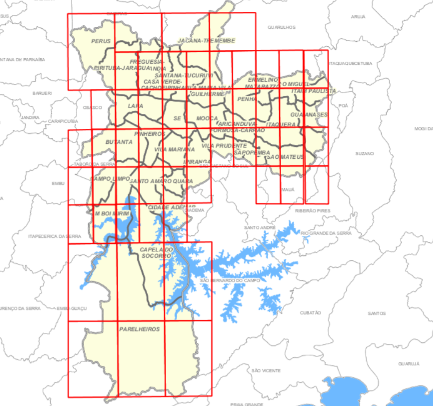 Índice das Cartas de Vegetação Significativa de 1988.Índice das ortofotos do Município de São Paulo, com nomenclatura aderente ao SCM (Sistema Cartográfico Metropolitano). O SCM corresponde ao malha de ortofotos ou mapas de formato uniforme e na mesma escala, com índice de referência, cobrindo uma região, e nesse caso específico, o Município de São Paulo.