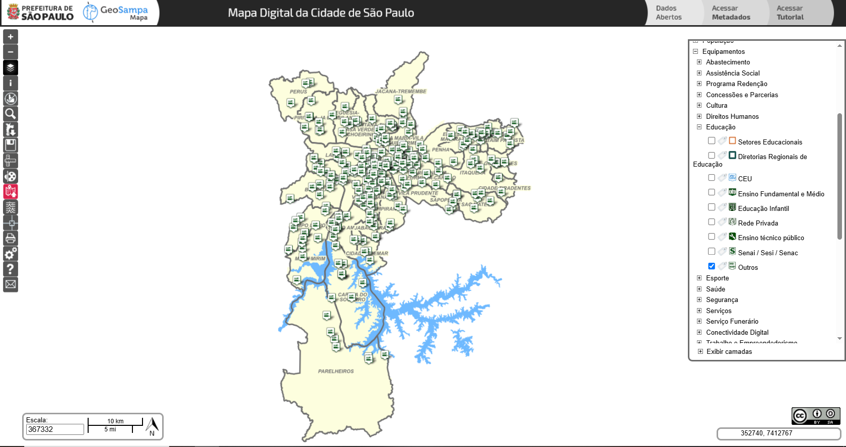 Escolas regulares não-convencionais no Município de São Paulo. A camada contempla as seguintes categorias de estabelecimentos: • Escola Federal • Escola estadual indígena • Centro de Línguas associado a Escola Estadual (CEL JTO) • Centro Estadual de Educação de Jovens e Adultos (CEEJA) • Classe em funcionamento em Unidade de Internação Provisória da Fundação Casa • Classe em funcionamento em Penitenciária ou Centro de Detenção • Estabelecimento vinculado à Universidade de São Paulo (USP) • Centro de Educação e Cultura Indígena (CECI) • Turmas de atividade complementar em Centro de Educação Unificado (CEU) • Escola Municipal de Educação Bilíngue para Surdos (EMEBS, antiga Escola Municipal de Educação Especial) • Centro Integrado de Educação de Jovens e Adultos (CIEJA) • Escola de educação profissional em nível de qualificação básica • Escola de educação especial Dados extraídos do Censo Escolar da Educação Básica, realizado anualmente em nível federal sob a responsabilidade do Instituto Nacional de Estudos e Pesquisas Educacionais Anísio Teixeira, do Ministério da Educação (MEC/Inep). O Censo Escolar é realizado anualmente e a declaração é obrigatória para todas as escolas públicas e privadas do país.
