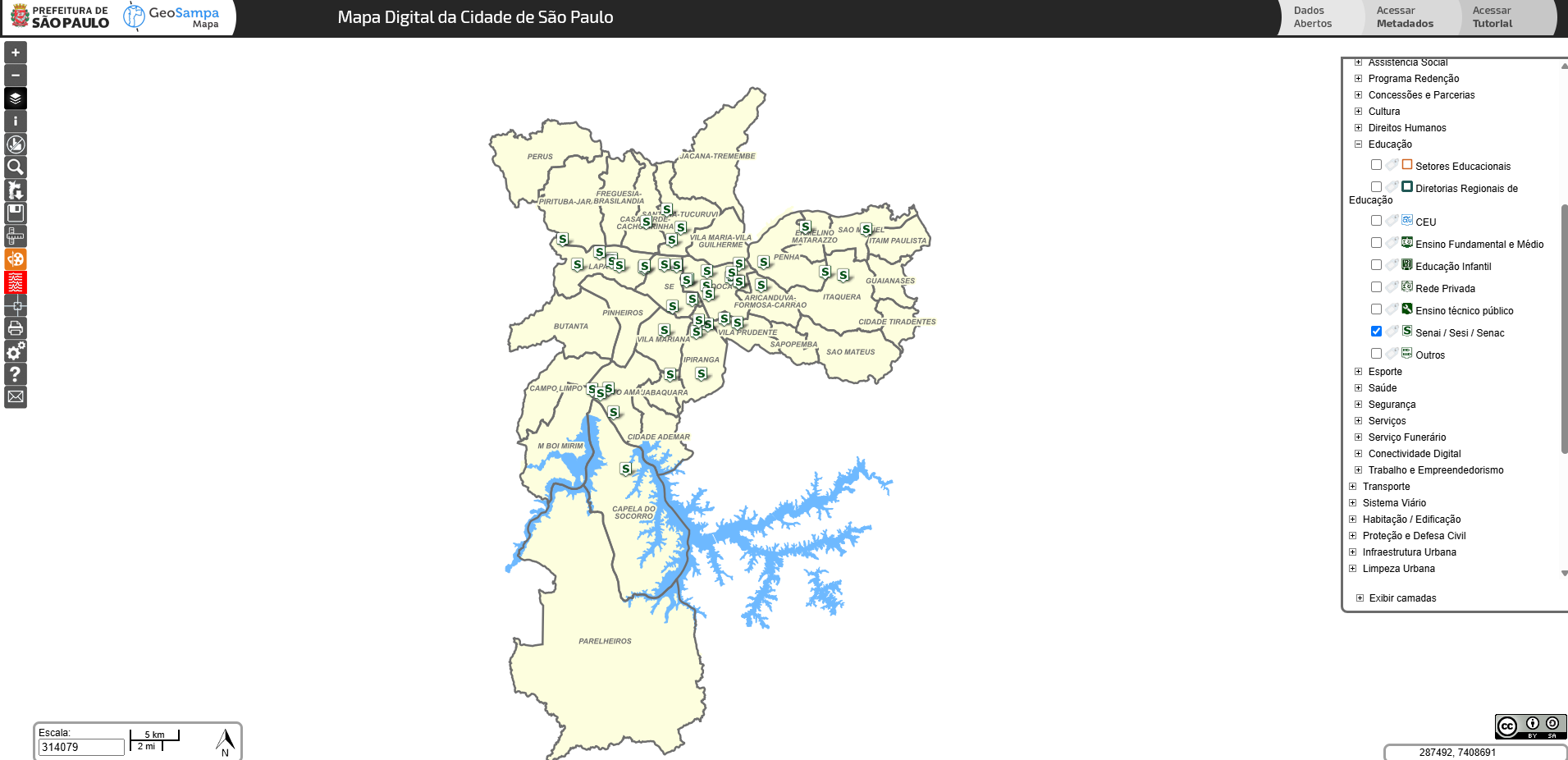 Identificação dos pontos georreferenciados de estabelecimentos como SENAI, SESI e SENAC no Município de São Paulo. A camada contempla as seguintes categorias de estabelecimentos: • Centro de Educação Infantil do Serviço Social da Indústria (SESI) • Centro Educacional do Serviço Social da Indústria (SESI) • Unidade do Serviço Nacional de Aprendizagem Industrial (SENAI) • Unidade do Serviço Nacional de Aprendizagem Comercial (SENAC) Dados extraídos do Censo Escolar da Educação Básica, realizado anualmente em nível federal sob a responsabilidade do Instituto Nacional de Estudos e Pesquisas Educacionais Anísio Teixeira, do Ministério da Educação (MEC/Inep). O Censo Escolar é realizado anualmente e a declaração é obrigatória para todas as escolas públicas e privadas do país.