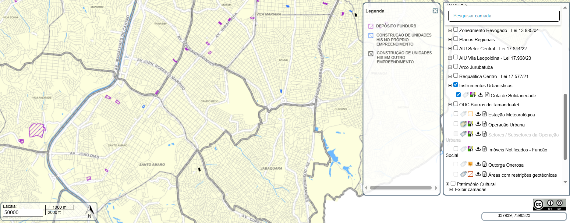 Espacialização, na forma de polígonos a partir dos limites dos lotes fiscais, dos processos de Aprovação de Edificação Nova que utilizam o instrumento da Cota de Solidariedade nos termos da Subseção IX do Plano Diretor Estratégico - Lei nº 16.050/2014. A Cota de Solidariedade permite que o empreendimento que a utilize tenha acesso à um acréscimo ao potencial construtivo adicional mediante contrapartida, que pode ser cumprida através de construção de unidades HIS no próprio empreendimento, alternativamente, podem ser destinadas em outro empreendimento, ou ainda através de contrapartida financeira destinada ao Fundo de Desenvolvimento Urbano – FUNDURB,, e de acordo com os critérios e procedimentos estabelecidos pelo Plano Diretor Estratégico (Lei 16.050/2014 e suas atualizações). O universo abrange processos desde 2014, ano da aprovação do PDE, e incialmente cadastrados pelos processos de Aprovação de Edificação Nova, atualizados conforme a expedição dos Alvarás de Execução de Edificação Nova e os respectivos Certificados de Conclusão que são enviados para a Coordenadoria de Legislação de Uso do Solo – DEUSO.