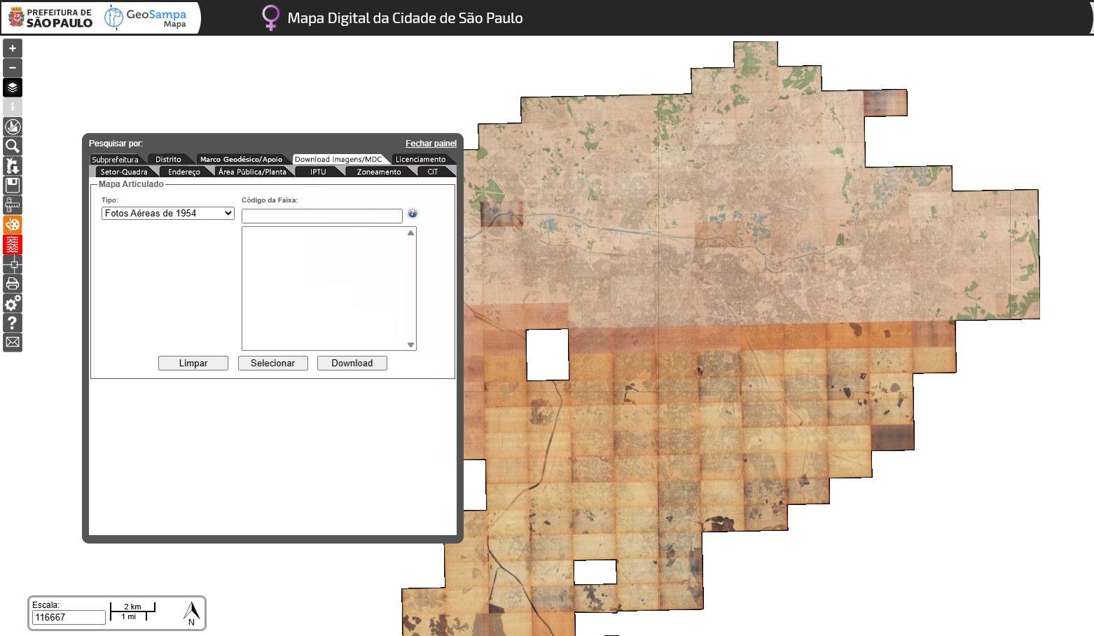 Restituição cartográfica do Levantamento Aerofotogramétrico executado por VASP aerofotogrametria S/A e Serviços Aerofogramétricos Cruzeiro do Sul S/A em 1954, disponibilizada para download. Para realizar o download, clicar na ferramenta "Pesquisar" (lupa) e aba Download Imagens/MDC.O download poderá ser realizado inserindo o código da faixa ou selecionando no mapa a área de interesse. Ressalta-se que alguns arquivos (exemplo folhas f13-22u e f18-02u) não estão disponíveis para download devido estas folhas não terem sido encontradas no acervo.