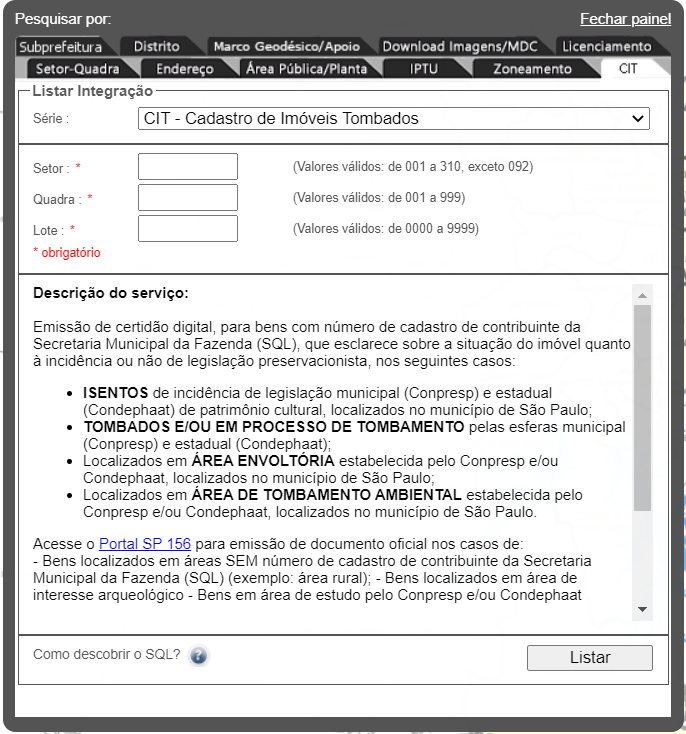 A verificação da incidência de legislação municipal, estadual e federal de patrimônio cultural em lotes fiscais tributários, no município de São Paulo, pode ser feita por meio do banco de dados do Cadastro de Imóveis Tombados (CIT). No portal Geosampa, é possível a emissão da respectiva certidão, a partir da barra de ferramentas à esquerda, acionando o ícone pesquisar (lupa) e a aba CIT.